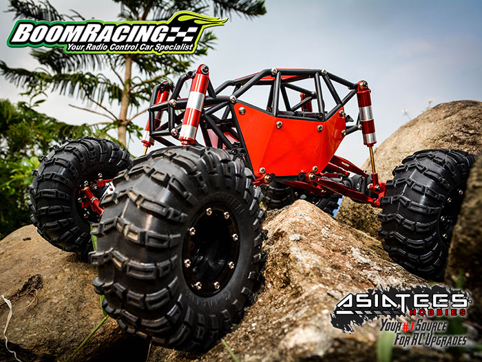 Taking the aluminum servo mount as an example, made of the CNC machined aircraft aluminum, the Boom Racing servo mount has exceptional quality and can be installed very easily. Machined from solid aluminum, the light weighted C-Hub can be used with the stock axles and bearings. Its one piece heavy duty design gives it extra durability facing various terrains. Like we've mentioned that R1 itself has many great designs. Portal axles simply mean the drive axles are above the center of the wheels. This gives the R1 greater ground clearance, beneath the axles, than other trucks using the same tires. Hence, the front skid plate seems not that important any more so Boom Racing brought us the center skid plate, which wraps under the car to help you run over the rocks better. Available in red, silver and gun metal colors, all the Boom Racing upgrades provided this time are direct replacements for worn or damaged stock parts.