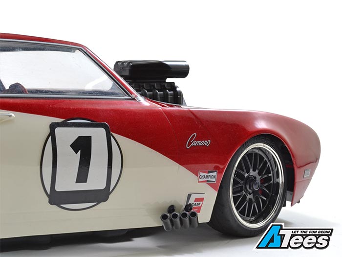 The Zoomies Mock Exhaust Headers will work with virtually any body from 1:18 - 1:10 scale. Zoomies mimic straight pipes that drop directly from the exhaust ports of the heads on a car. You're most likely to see them popping out from under Nitro Funny Car bodies but many old-school classic muscle cars can run them as well.