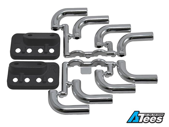 The scale accessory is designed to mount directly to the body. They can be mounted straight up, angled backwards (or even forwards) and in some cases such as monster trucks, can even be mounted with the exhaust ends pointing down. Each set of RPM Zoomies Exhaust Headers comes with two mounting plates and a total of 8 exhaust tips (four per side).