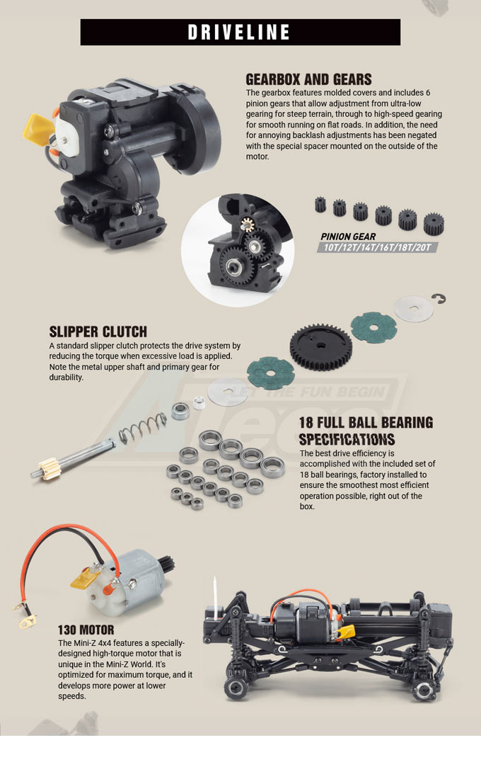 - The gearbox features molded covers, ball bearings, and 6 pinion gears that allow a full range of adjustment according to your chosen terrain. As with all Mini-Z models the gear mesh is easily set using the provided spacers.