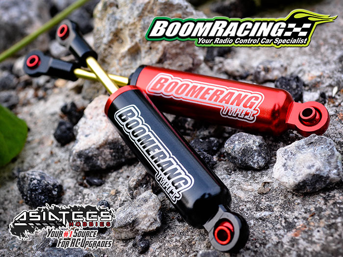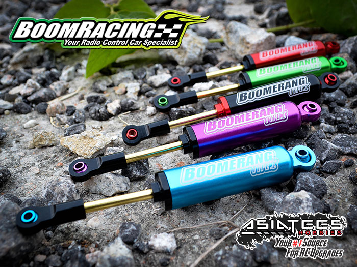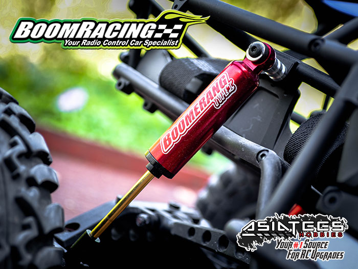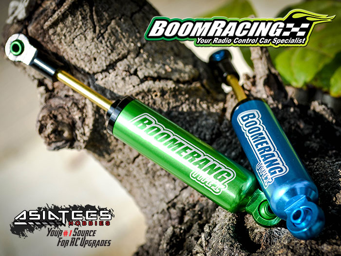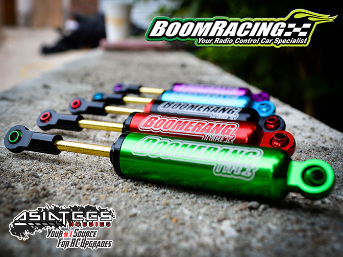 The Boomerang by Boom Racing is an extremely durable shock set made from hard anodized aluminum. The Boomerang utilizes a droop setup that will keep your truck low to the ground, lower than a normal spring shock setup. The center of gravity will be lower, and as a result, will keep the truck more stabilized, as the wheels can remain in contact with the ground on uneven terrains.