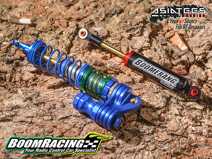 Let's begin with the best looking scale truck aluminum shocks from Boom Racing, the Boomerang Type I. The extremely durable shock set is made from hard anodized aluminum, utilizing a droop setup that will keep the truck low to the ground for easier stabilized crawling. The Boomerang comes in different colors and length (90mm, 100mm, 110mm) with 3 different rate of springs sets included. What makes these such good looking dampers are the vivid colored coating on the surface of the shock body and the high quality material used on the shock body design.