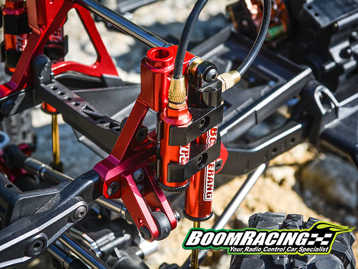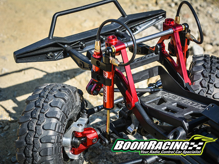 Boom Racing is now offering sweet, sweet upgrades for the Ascender, so get kitted out in that aluminum! Front and rear shock towers, hubs, knuckles, and skid plate all get the treatment. We swapped 'em in and added a set of Boomerang Type G piggyback shocks for good measure in the same color for that red and gold eye-catching combination.