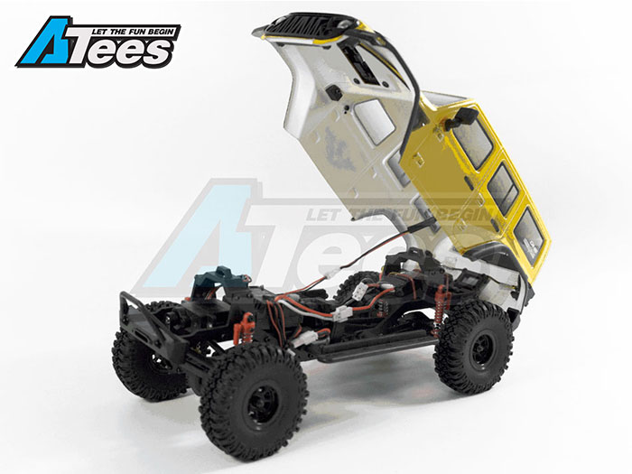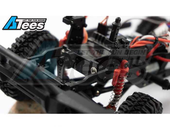 Sitting upon the trail proven CR18 chassis, the KRATOS has massive axle articulation with minimal bump steer thanks to its multilink chassis geometry and Panhard bar. An uprated 050 55T motor provided ample power and low-end torque. The snorkel isn't just for show either- with water-resistant electronics as standard, the Kratos could even be fully submerged for short periods of time when necessary!