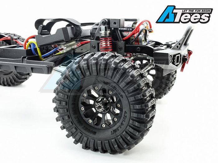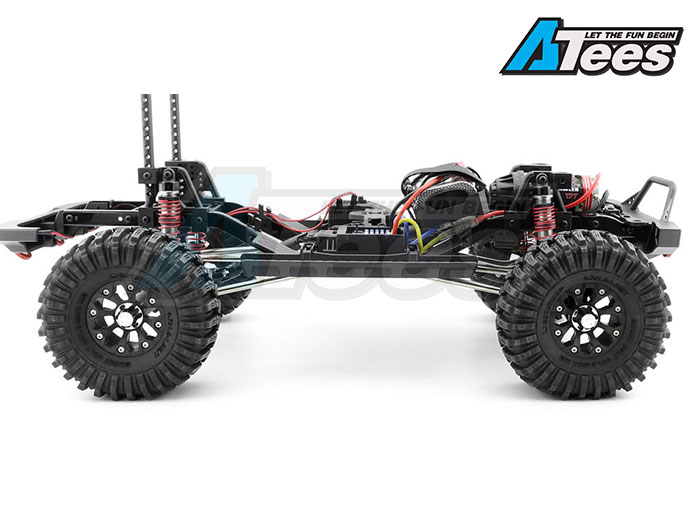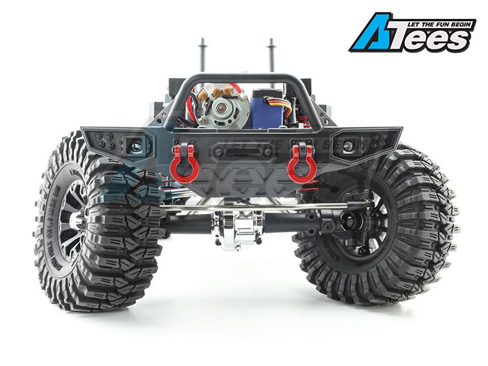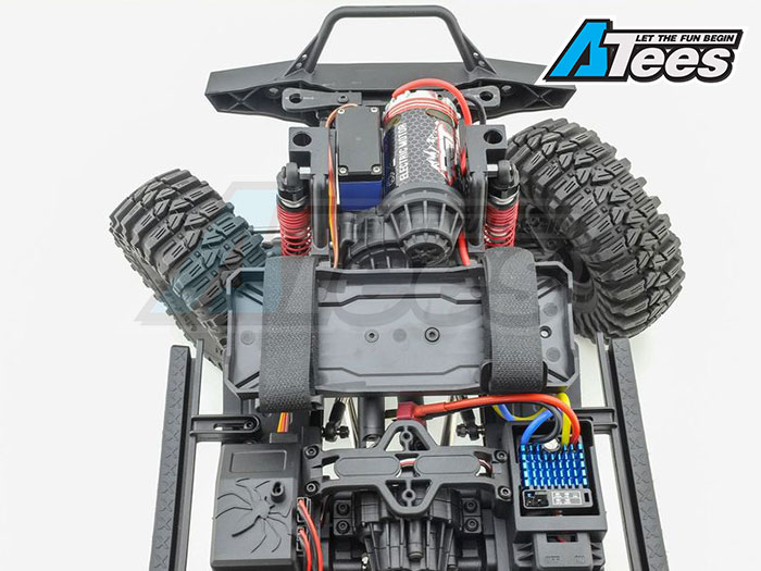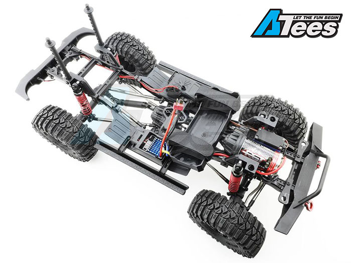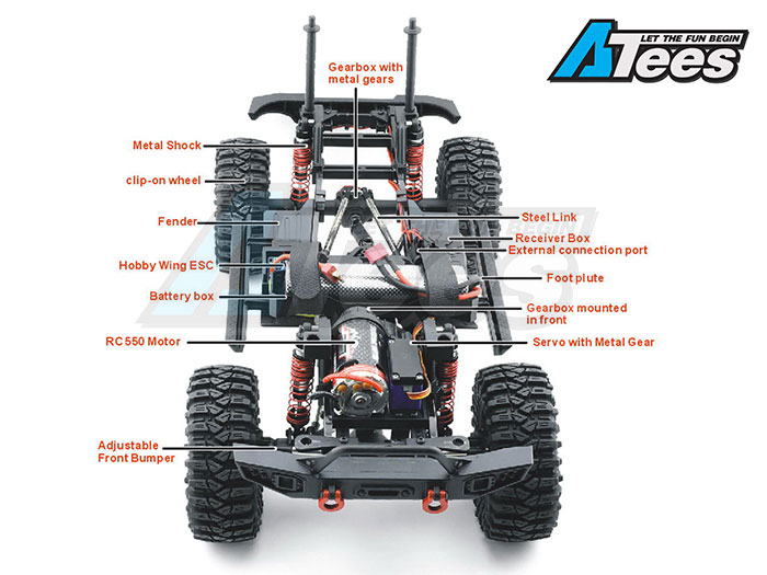 This ready-to-run vehicle is configured with a large 550 sized 17T super torque motor, the Hobbywing WP-1060 ESC for crawlers which supports LiPO mode, 15KG waterproof servo with all-metal gear, 7.2V 2000mAh NiMH battery pack, and a special 4-channel radio with integrated light set controlling function.