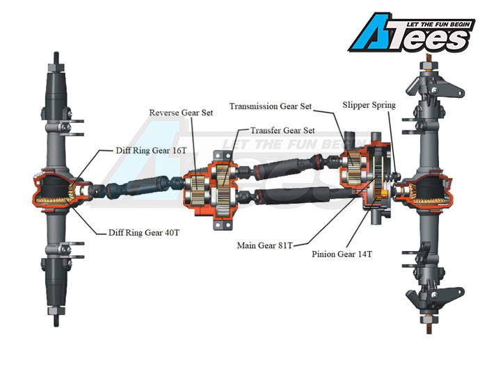 The Central Transfer Case has a reverse gear set, the front and rear driveshaft connected to the gearbox rotates in opposite directions. The front driveshaft rotates clockwise, while the rear driveshaft rotates anticlockwise. The reverse drive design reduces the axle effect during operation for a more balanced performance including foot-liftings and rollovers.