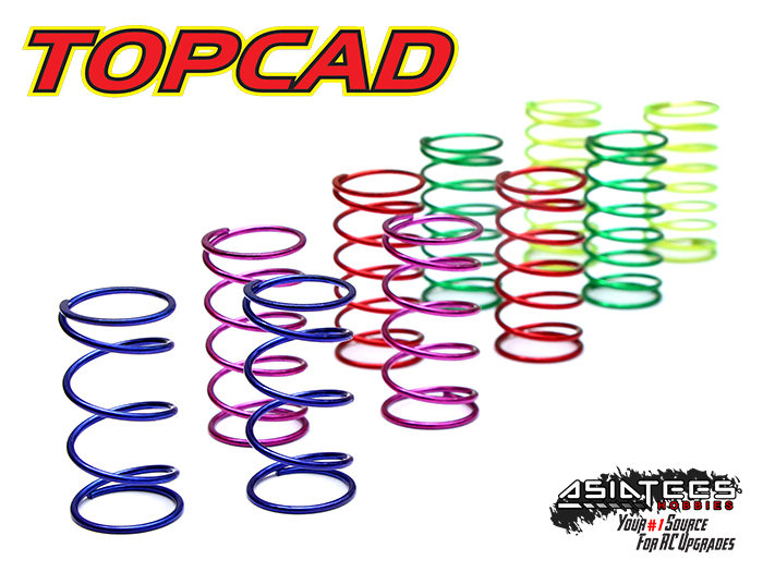 This #50102 - TopCad all touring car spring set, has 5 different kinds of spring rates– super hard-blue, hard-purple, medium red, soft-green and super soft-yellow. Super Hard springs are suitable for high-grip track which aren't too bumpy. The medium and soft spring sets are suitable for mildly bumpy tracks, it allows you to have a smoother run and better steering on the car. But remember don't use super soft springs unless you are going to run on very bumpy tracks, since if the springs are too soft, it can make the car hook and spin and and they can also make it react sluggishly.