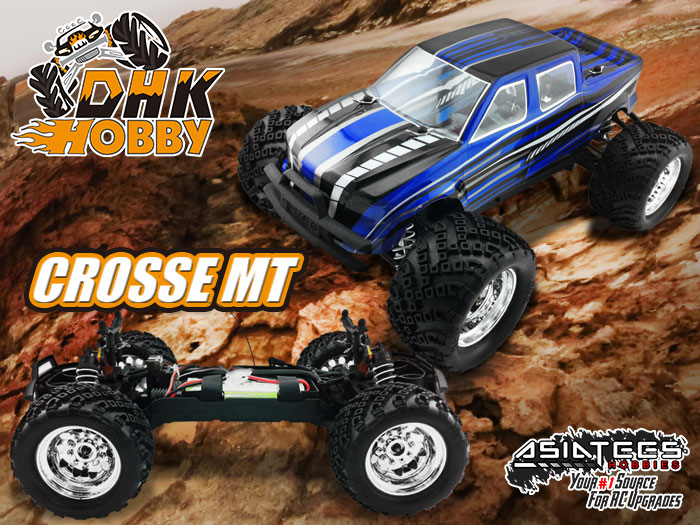 This 1/10th scale RTR model packs in everything you will need for a powerful monster truck. It is part of the DHK truck family but it's different from all of its brothers. DHK designed it from the ground up. The Crosse MT is built tough with the new chassis, making sure it holds all the electronics under all the hits. New shock absorbers will show up with white shock springs. Even the tires with this model are different from before. It features chrome wheels with tires that have DHK logos on. Battery mount is well built in case you want insane speed and legendary durability from great batteries.