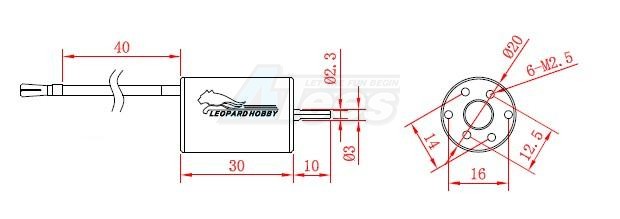 Code Leopard 2-Poles Inrunner Brushless Motor LBA2030/12T Max Amps(A) 18A No of cells (lipo) 2S Max Power 138W KV(RPM/Volt) 7780KV Resistance 0.0325 No-load Current(7.4V) 2.2A Mounting hole depth(mm) 2.5 Shaft Diameter (mm) 2.3 Shaft Lenghth (mm) 10 Diameter×Length (mm) 20.0×30.0