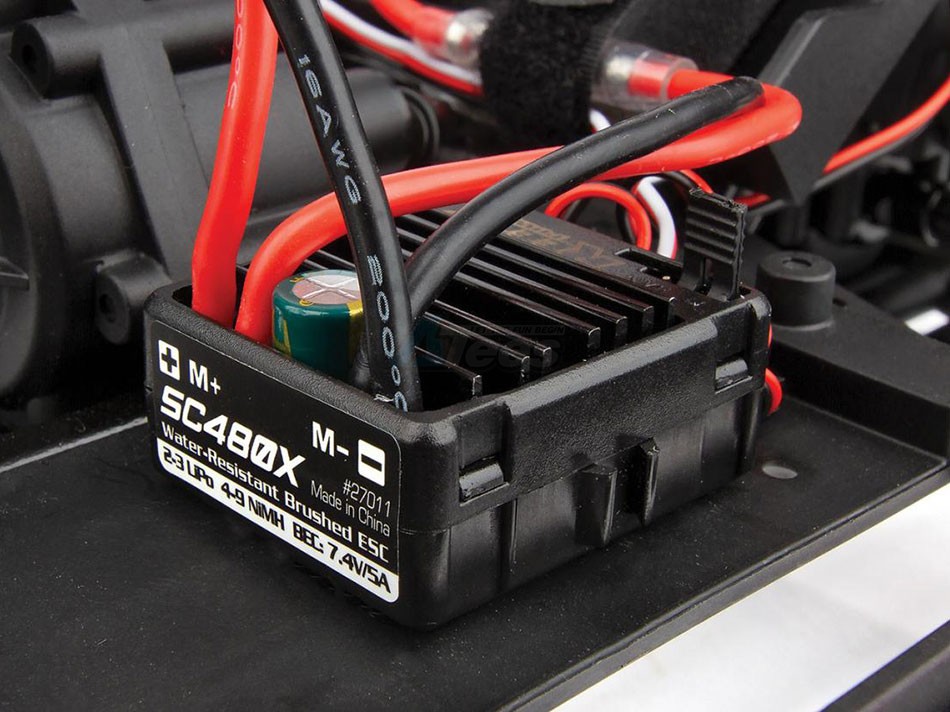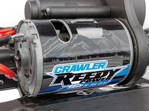 Reedy power electronic speed controller (ESC): The water-resistant SC480X brushed ESC is specifically programmed for crawling with proportional forward/reverse, dual auxiliary power output leads, LiPo low-voltage cutoff protections, and T-plug connector.