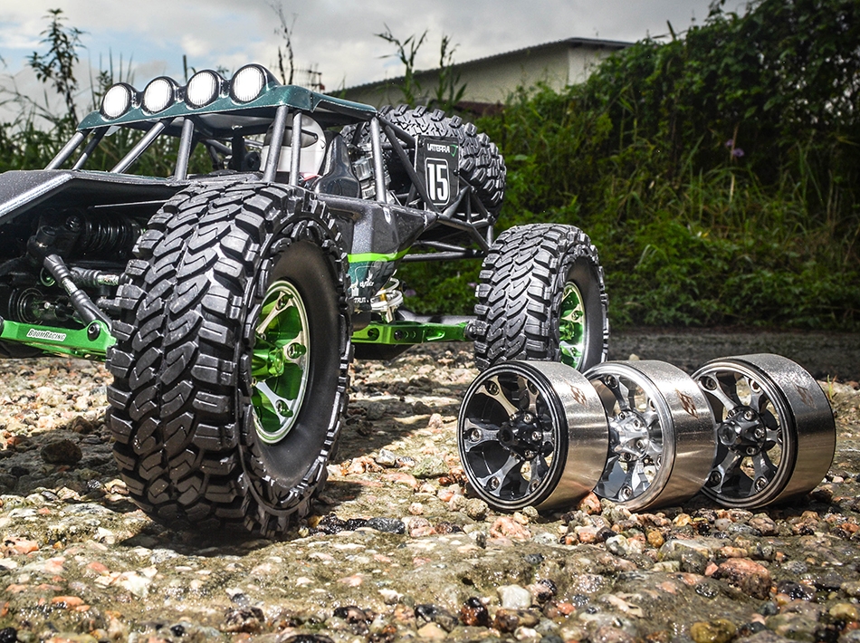 1.9" (48mm) heavy-duty anodized aluminum beadlock EVO six-spoke wheels from Boom Racing, with Type C styling.