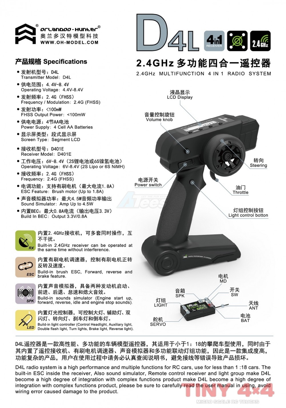 D4L Radio system is a high performance and multifunction controller for your RC car. This system is great for rigs that are smaller than 1/18 scale. There are three other functions built into the receiver, the first function is the ESC is part of the receiver.