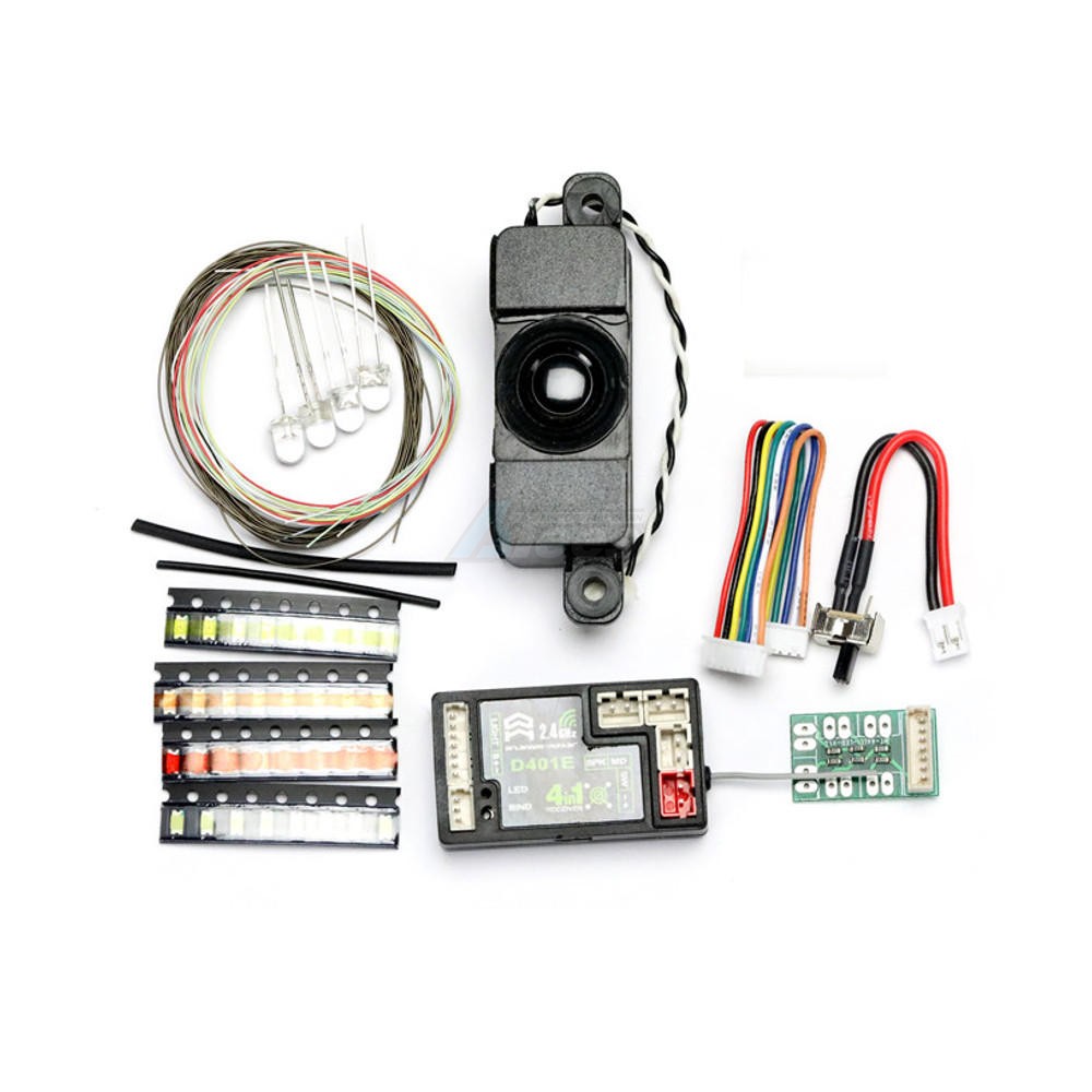 The second function is there is a speaker included that you plug into the receiver for sound and the third function is you can turn your LED lights on and off using your transmitter. The LED’s are also included but you have to solder them together yourself.