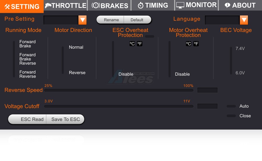 - Set and store 10 sets of profiles in the ESC. These data could be called out at any time without any special program setting. All the setting can be exported or imported so that the user could compare and analyze