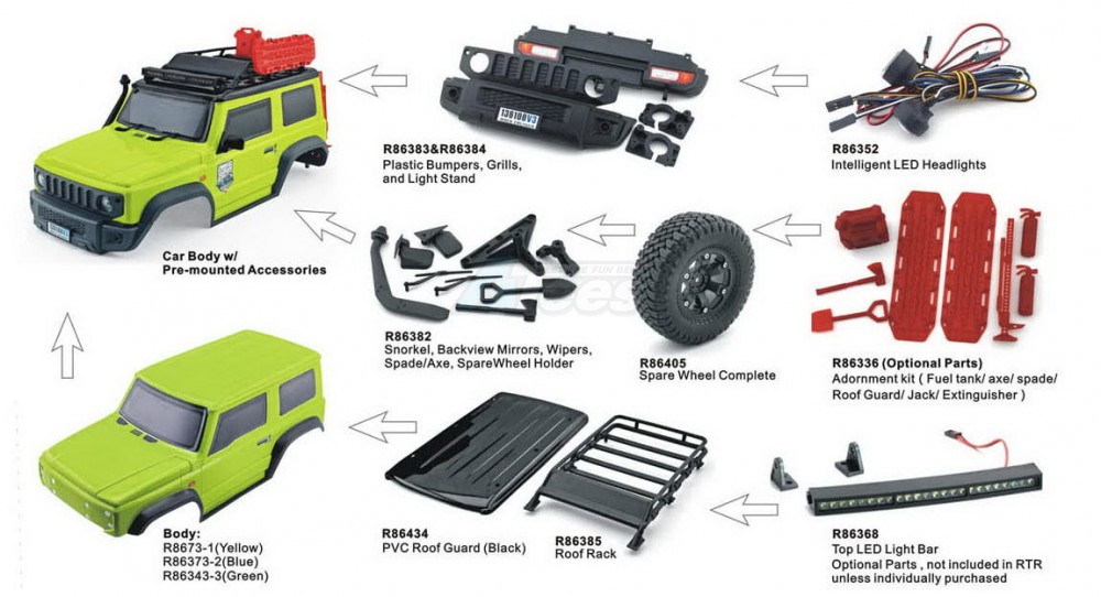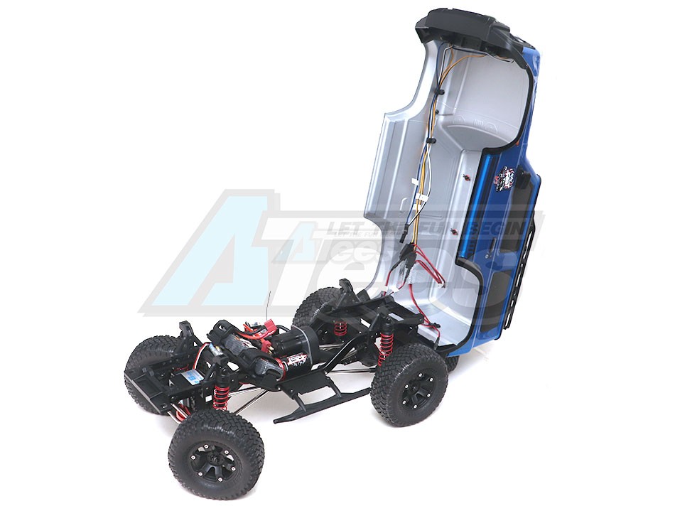 - Hidden front body post and flip body design, no hole in the body surface. Realistic Bodyshell, equipped with front and rear bumper, grill, snorkel, rear-view mirror, wiper, roof rock, and other body accessories, and the smart LED light set.