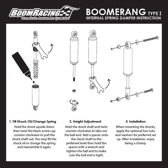 - Factory description: Boom Racing Boomerang Type I Aluminum Internal Shocks Set 110MM (2)