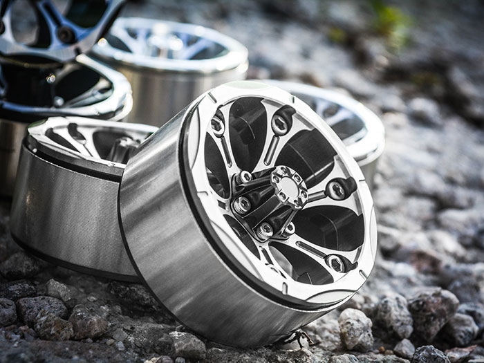 1.9" (48mm) heavy-duty anodized aluminum six-spoke beadlock wheels in 'Chroma' styling from Boom Racing.