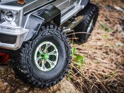 Packing 115g of extra weight per wheel, these monster wheels are compatible with a wide range of 1/10 crawlers, such as the Axial SCX10, Wraith, or TF2. CNC-machined from aluminum. Available in a range of styles. Anodized finish available in metallic green, black, silver or gunmetal colors. - Color: Green