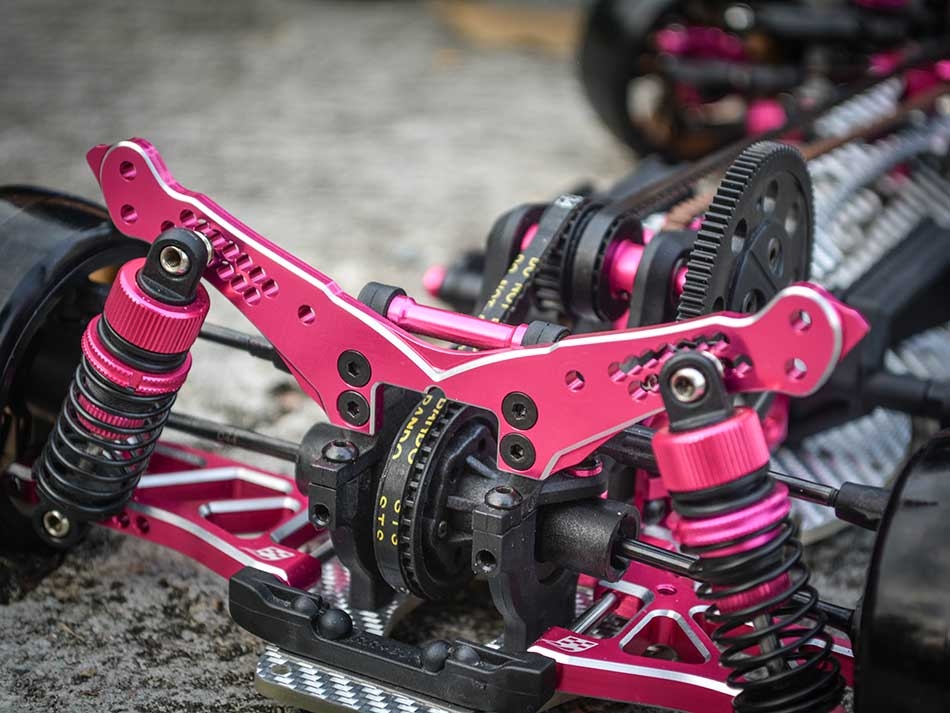Replacement for the stock FRP part and compatible with both AWD and RWD versions of the Sakura D4. Available in signature Sakura anodized pink, gun metal, or silver. Includes 4 mounting screws.