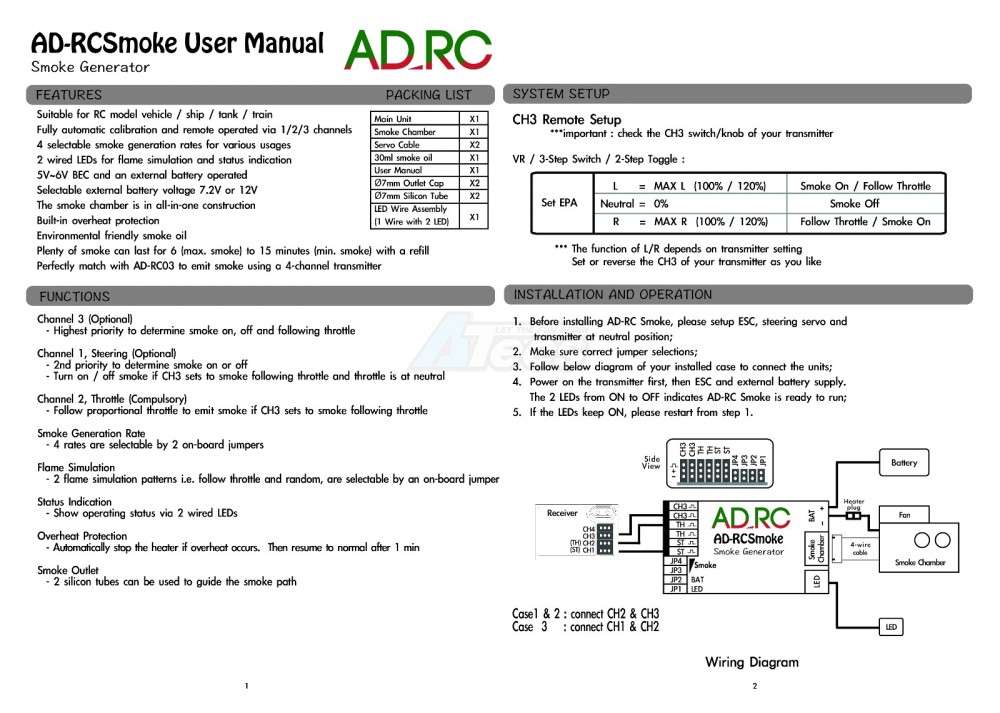 Perfectly match with AD-RC03 to emit smoke using a 4-channel transmitterFUNCTIONS