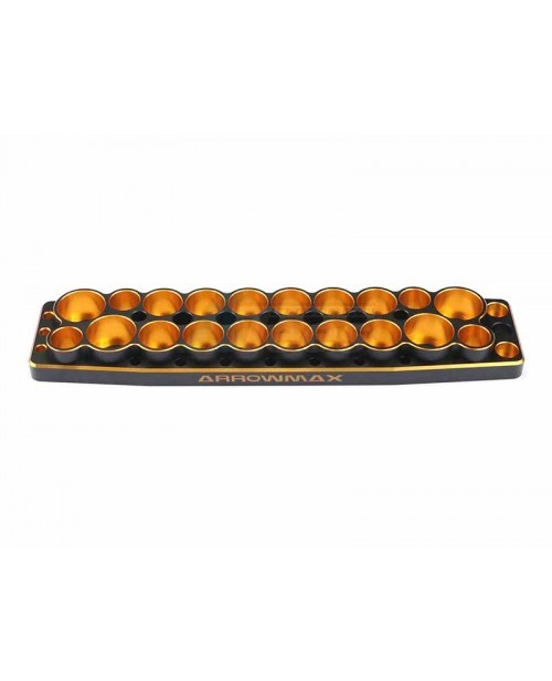 Arrowmax are now sending their ever popular V2 tools base for the Black-Golden treatment. Our Tools base had been helping thousands on turning there pit desk into a organize and tidy work place. The Version 2 design go one step further: by including special slot for our ever popular AM-190031 Multi Shock Clamp and our V2 line of Turnbuckle wrench. Placing and founding the right tools cannot be easier. Design to fit 4x22mm handle (7mm Socket Driver, Reamer etc.), 4x14mm handle (60mm Tools) and 12pcs 18mm handle tools. Plus your Multi Shock Tools and 3x our V2 line of Turnbuckle wrench. One base, 24 tools!