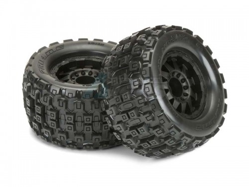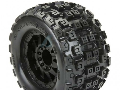 This is a pair of pre-mounted Badlands MX38 Tires. Pro-Line is taking the 3.8” tire game to the next level with the Biggest and Baddest tire ever conceived: the Badlands MX38! Pro-Line Badlands tires are known for having a sweet Motocross inspired tread and the all-new Badlands MX38 tires kick that up a notch with a Bigger and Bolder knobby tread that matches modern MX tire design. The Badlands MX38 is a true All-Terrain tire that will find traction on any surface but is best suited for loose & loamy dirt, mud or grass. Just imagine your truck throwing up huge rooster tails with these awesome looking tires! Compared to the previous Pro-Line Badlands tires, you can expect even better traction, improved wear resistance and enhanced style.