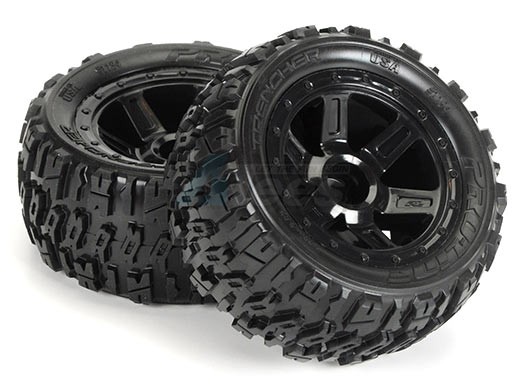This is a pair of pre-mounted Trencher 2.2” 1:16 E-REVO® Tires. Leave a mark with your Mini E-REVO wherever you go with Pro-Line’s Trencher tires. The Trencher 2.2” tires are designed to give your Mini optimal traction on just about any surface. Super cool horizontal H shaped treads give your truck ridiculous amounts of forward bite. With a tall tread height, you’ll find that durability and longevity are second to none. The Trencher is the Ultimate Bashing tire!