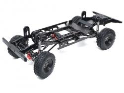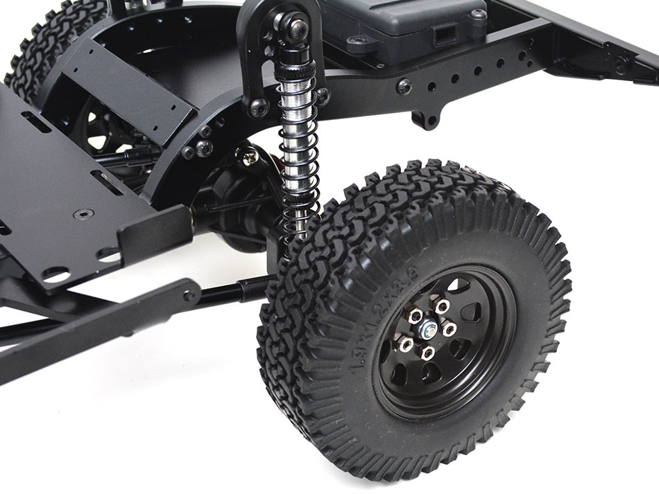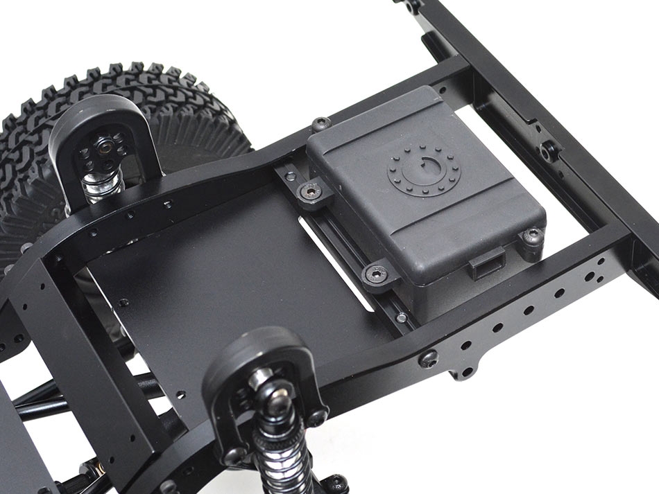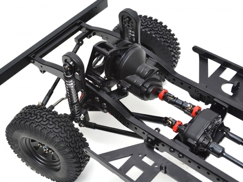 The chassis includes Team Raffee Co. Complete Scale Axles, steel front and rear front and driveshafts, driftshaft from motor to transfer case, aluminum shocks, 1.9 beadlock wheels and tires, transmission, T-case, aluminum links, HD gears, battery plate, body mounts, skid plate, aluminum links and plastic ballends, rails and bumpers, shock towers and receiver box.