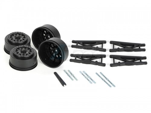 This is the ProTrac™ Suspension Kit for the Slash® 4x4. Pro-Line's new ProTrac™ Suspension kit for the Slash® 4x4 is an easy to install kit that greatly increases forward acceleration, corner speed, consistency and drivability. Pro-Line revolutionized the 2WD Slash® with the original ProTrac™ Suspension kit and now the same advantages are available for your Slash® 4x4! The kit includes longer Front and Rear suspension arms for improved handling, ProTrac™ wheels that bring the truck back to Stock ROAR Legal width and new longer turnbuckles. The ProTrac™ arms not only look tricker than the stock arms, but they are beefier and have more suspension adjustment holes so you can dial in the truck to your track. Also, Pro-Line’s ProTrac™ wheels have become the standard in the 4x4 SC class with the SC10 4x4 and SCTE 4x4 both capable of running ProTrac™ wheels. If you only do one upgrade to your Slash® 4x4, this is by far the one to have because Pro-Line's new ProTrac™ Suspension kit will transform your truck into a true RACING MACHINE!