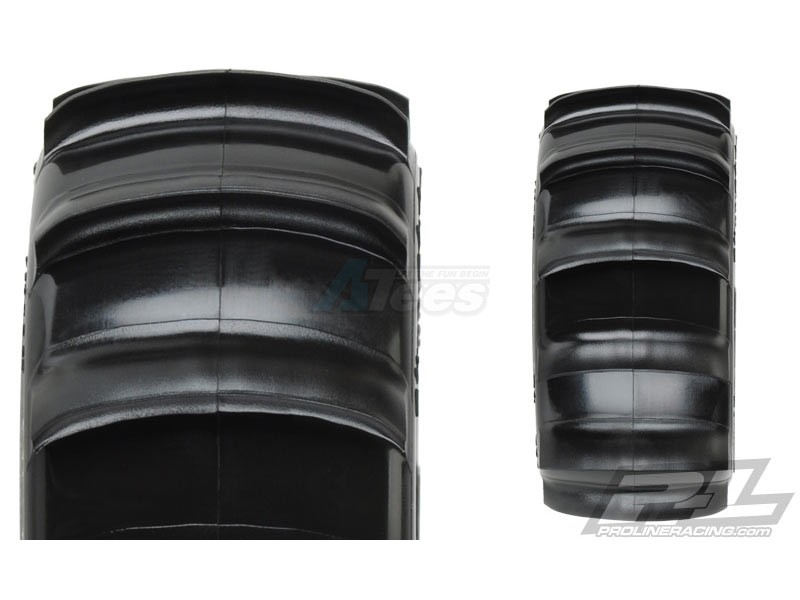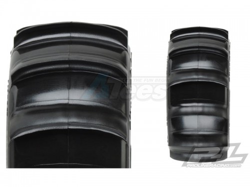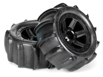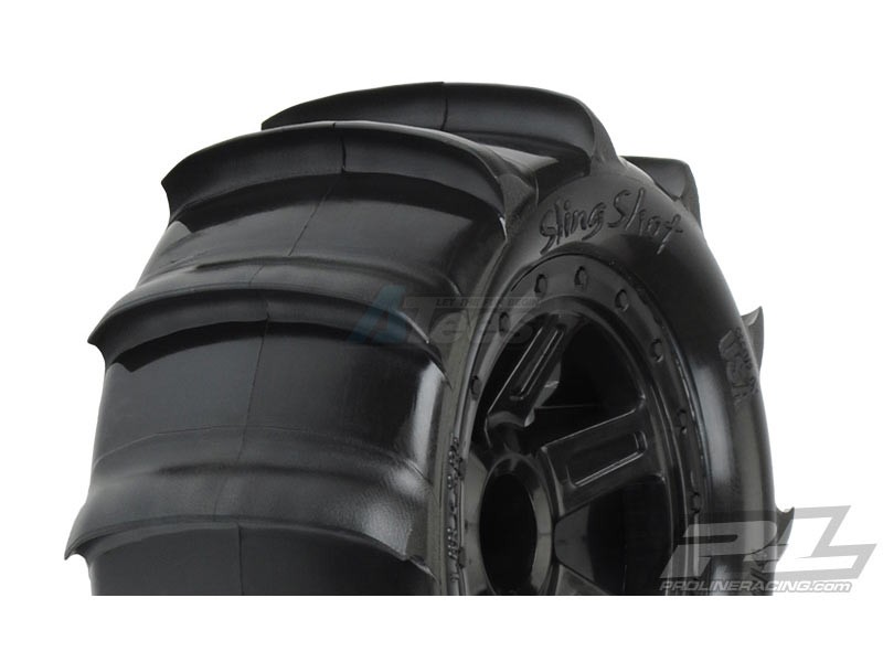 This is a pair of pre-mounted Sling Shot 2.2” Paddle Tires. The newest form of fun is here with the release of the Sling Shot 2.2" paddle tiremounted to Desperado wheels for mini E-REVO® trucks! The Sling Shot provides hours of fun in the sand, snow or even in the occasional mud pit. The 12 paddle design ensures maximum performance due to the true scoop design coupled with low roll outer sidewalls. The Sling Shot comes complete with foam inserts and big Pro-Line fun!