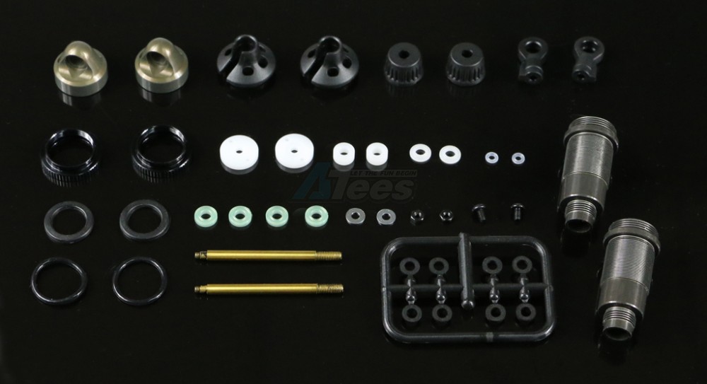 The Pro sets include hardcoated shockbodies, hardcoated shockcaps (emulsion/membrame), machined pistons 2-hole 1.3 dia, machined spacers, travel-limiters, pre-oiled x-rings and Tin coated shockshafts.