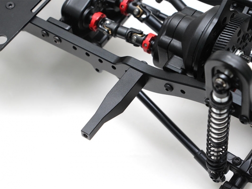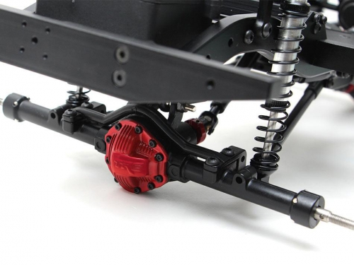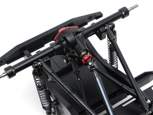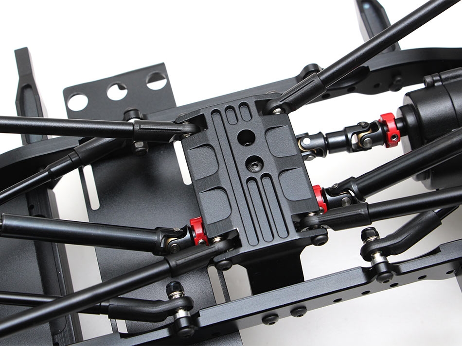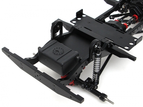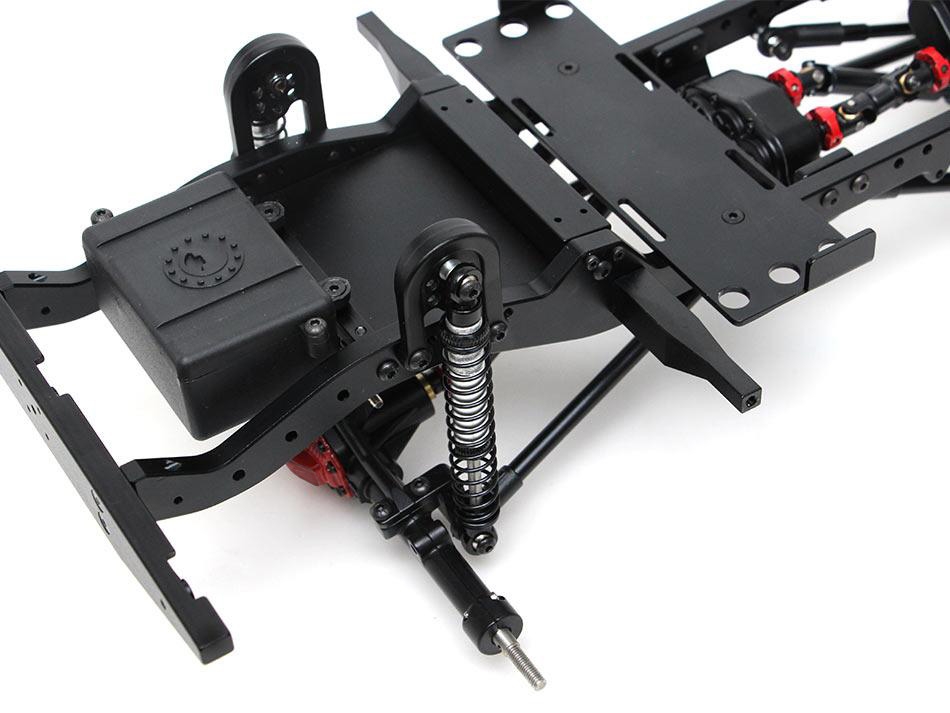 The chassis includes Team Raffee Co. Complete Scale Axles, steel front and rear driveshafts, driveshaft from the motor to transfer case, aluminum shocks, 1.9 Beadlock wheels and tires, transmission, T-case, aluminum links, HD gears, battery plate, body mounts, skid plate, aluminum links and plastic ball ends, rails and bumpers, shock towers and receiver box. The body is also included.
