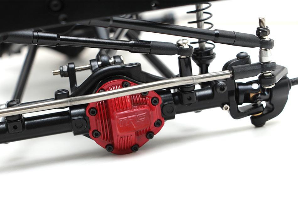 The Team Raffee Co. D90 Metal Chassis Kit has a front 3-link setup with chassis-mounted servo (CMS) and a Panhard mount. Rear runs links as well.