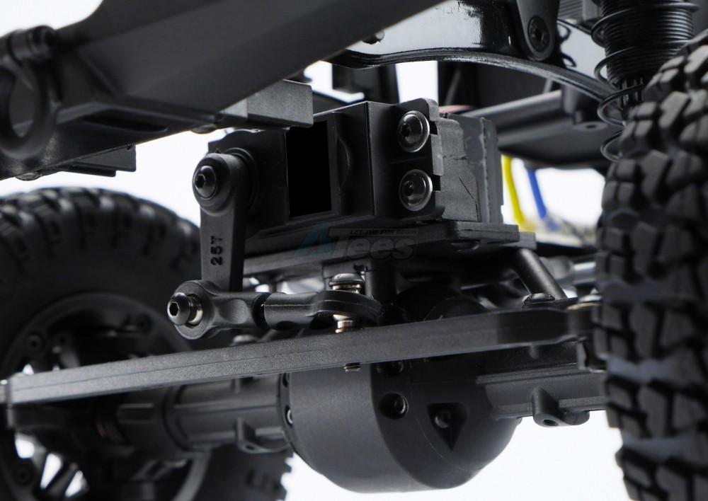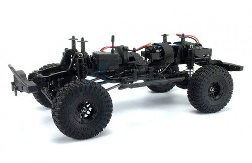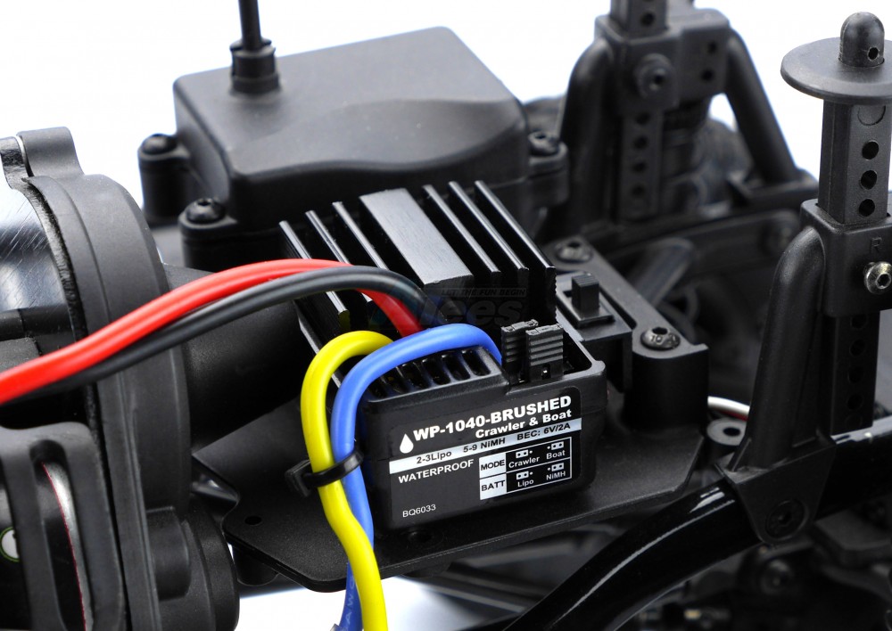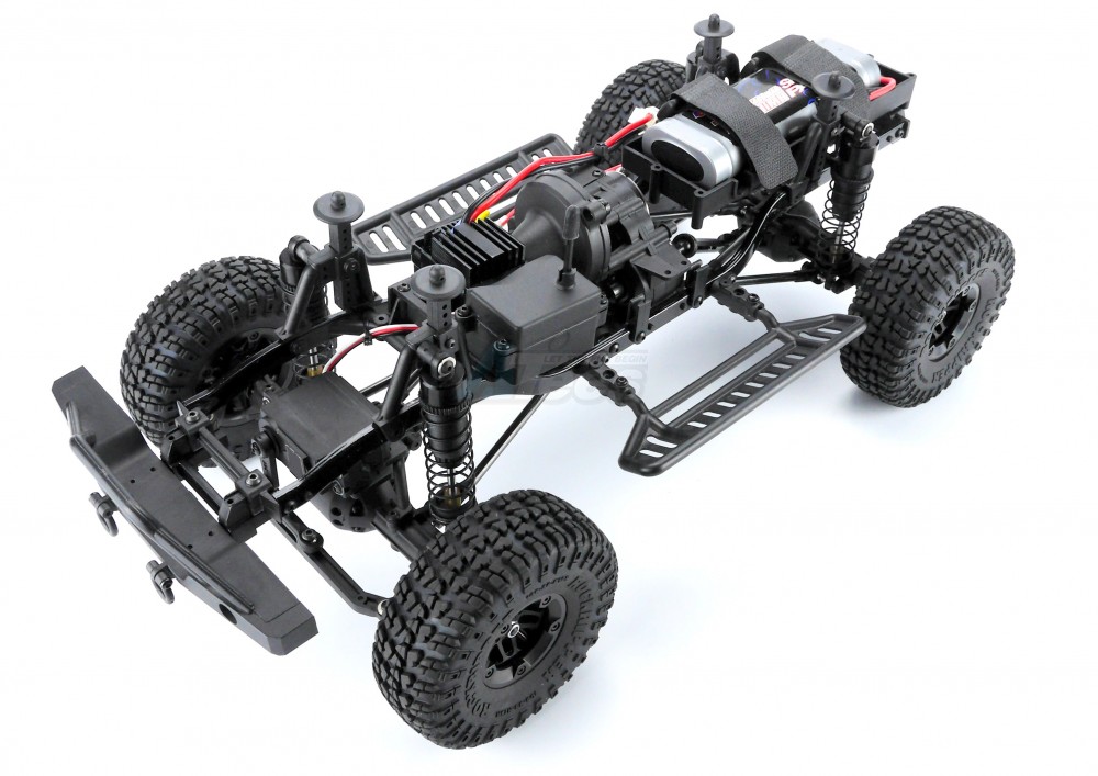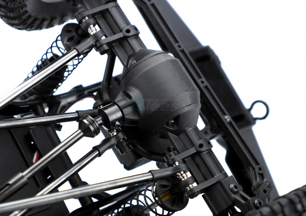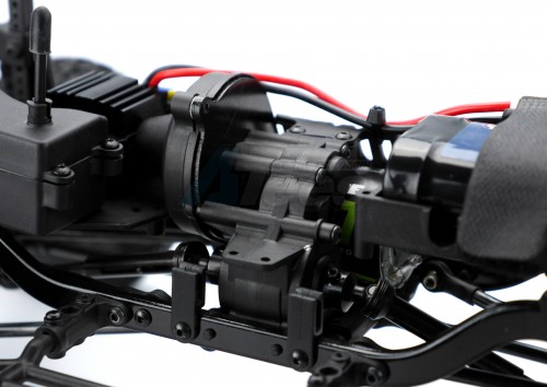 It’s not a competition rig; it doesn’t have any fancy gimmicks or technology, but it is a robust, well-designed, and tested one-box solution. Just charge the pack and hit the trails. It really is as simple as that. But looks can be deceiving: Underneath the understated shell is a full steel UJ equipped driveline with a locked-axle transmission to generate maximum traction from the slipper clutch protected gearbox, right through to the wheels and tyres. A 35T brushed motor offers the perfect balance between torque and RPM, and true 4-link double triangulated link geometry is used to minimise axle steer. The high torque, axle mounted servo can be chassis mounted in the future if so desired, and the waterproof electronic speed control is programmable for both NiMH and LiPo use, with a crawler mode set as its default which offers instant reverse and always-on drag brakes.