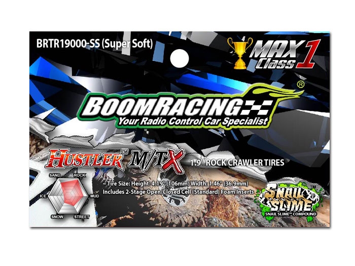 - Factory description: Boom Racing HUSTLER 4.19 M/TX 1.9 Max Class 1 Rock Crawling Tires (Snail Slime™ Compound) W/ 2-Stage Foams (Super Soft)