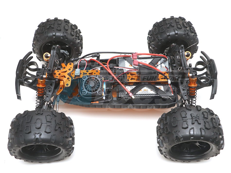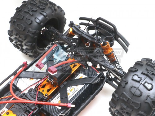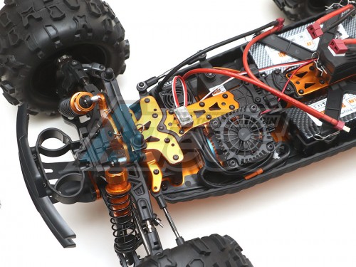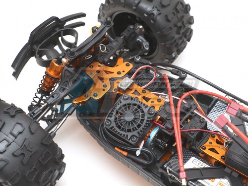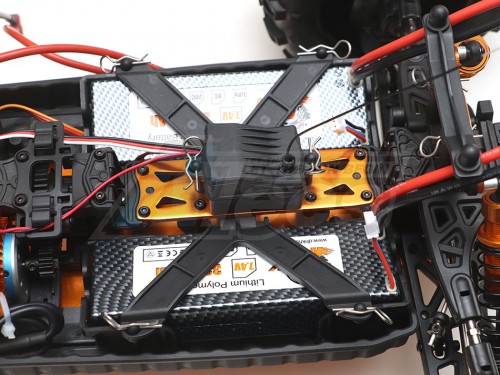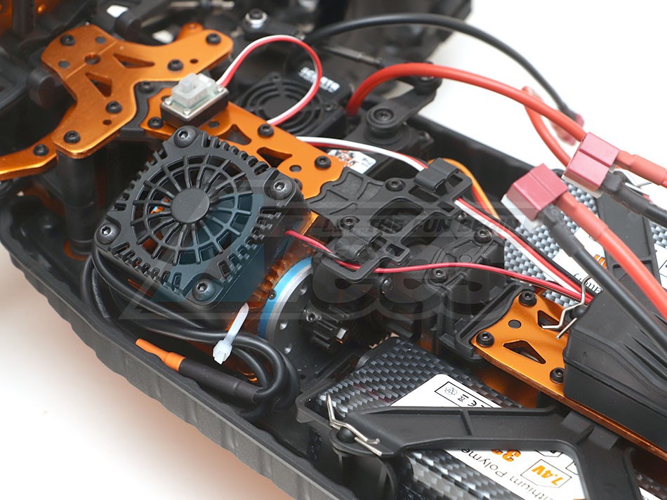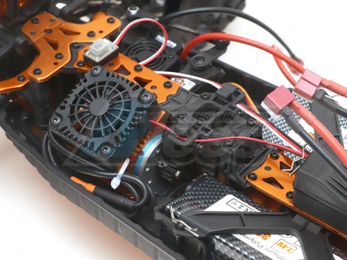 The high power brushless motor coupled to a durable 80A, fan-cooled ESC extracts maximum performance and fun from the included 2 x 2S cell 3200mAh Li-Po batteries wired into 4S. Enough to give even the most serious.21 nitro engine a run for its money! Keeping the motor cool is handled by the fully-finned, CNC-machined motor mount. The Maximus even has an electric fan to keep the motor cool, usually an option part of many cars.
