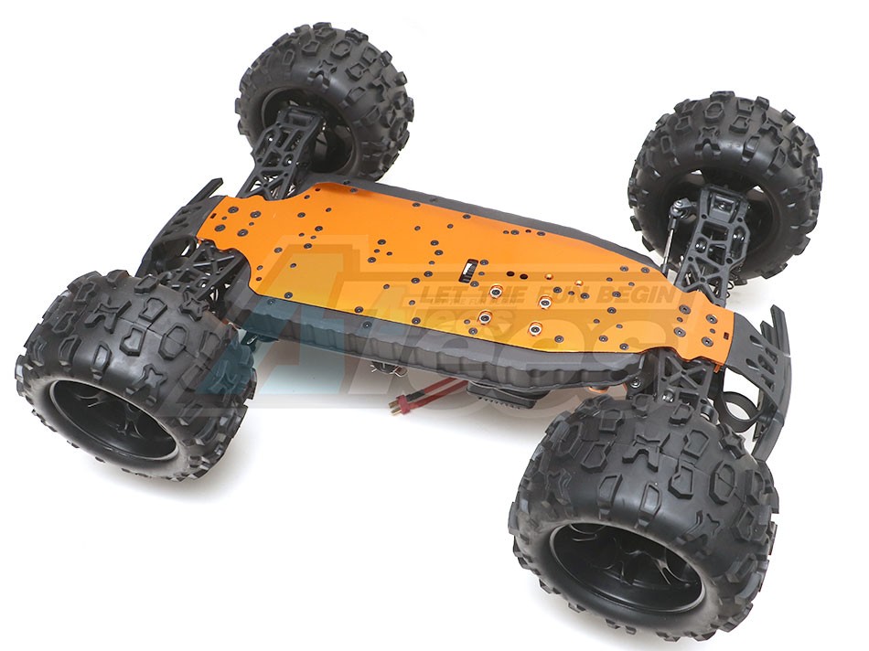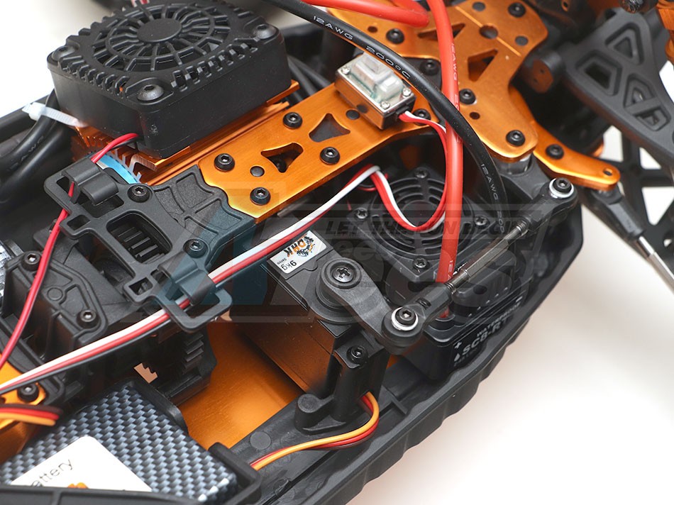 The anodized, T6 3mm aluminum chassis has all the screws recessed to limit damage to the heads, and the side protection plates for the radio are molded in tough plastic to resist knocks over and over. The top spine again uses anodized aluminum and creates a really strong structure to resist bending in jumps and rough off-road driving.