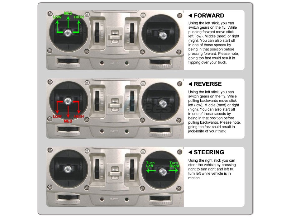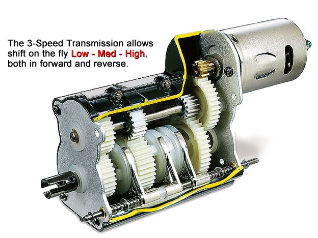 The Tamiya 3-Speed Transmission allows shift on the fly Low - Med - High, both in forward and reverse.
