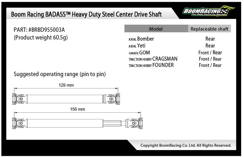- Factory description: Boom Racing Gmade GOM BADASS™ HD Steel Center Drive Shaft Set for Gmade GOM Front & Rear (2)