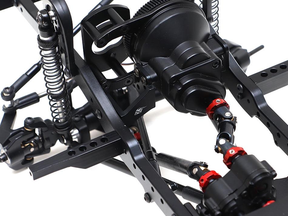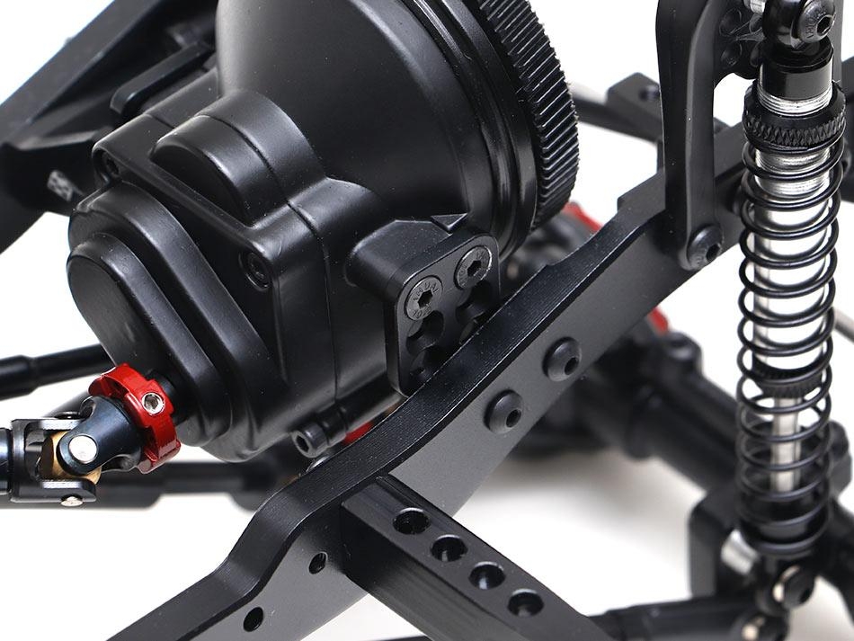 The included adjustable gearbox mount raises the gearbox a little bit higher for more clearance of the upper link and the driveshaft. At the same time it allows you to lower the motor position so that the center of gravity is still in about the same position as the stock position.