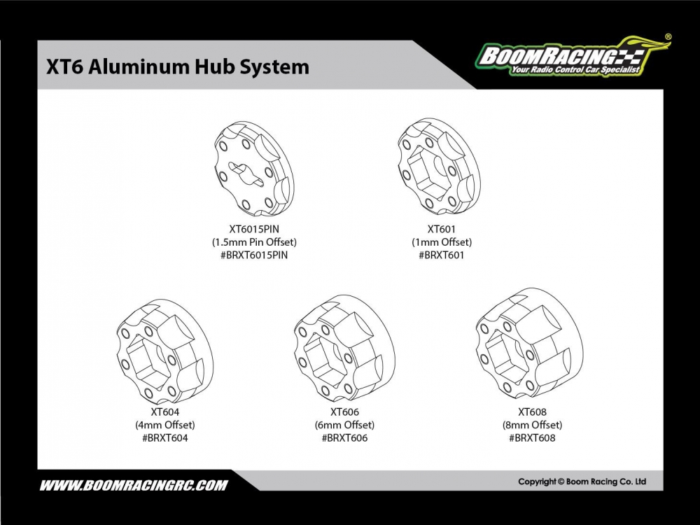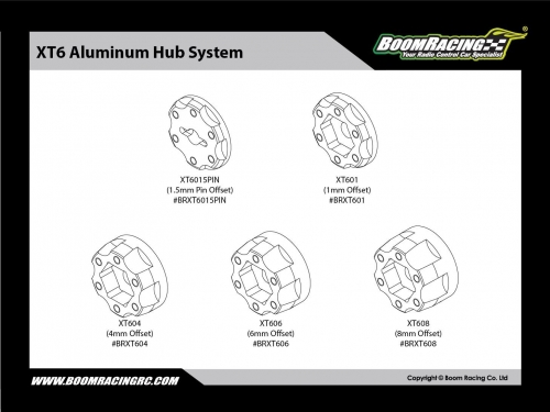 - XT6 KRAIT aluminum wheel hub adapter fits Boom Racing ProBuild and TE37 KRAIT beadlock wheels. XT6015PIN is six lugs and 1.5mm pin offset. Uses M2.5 bolts. This hub does not require using hex.