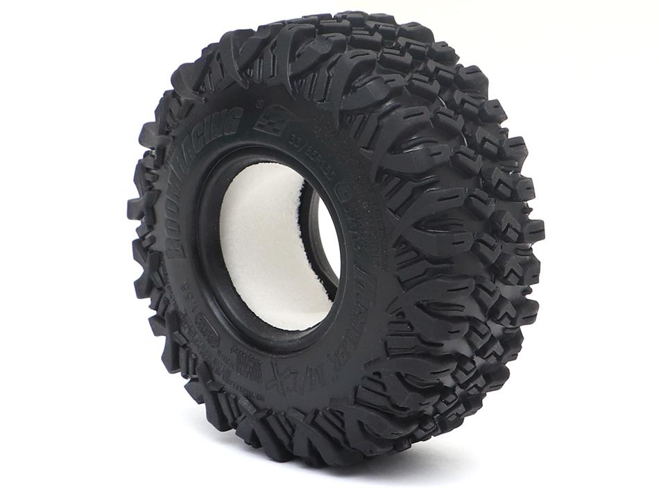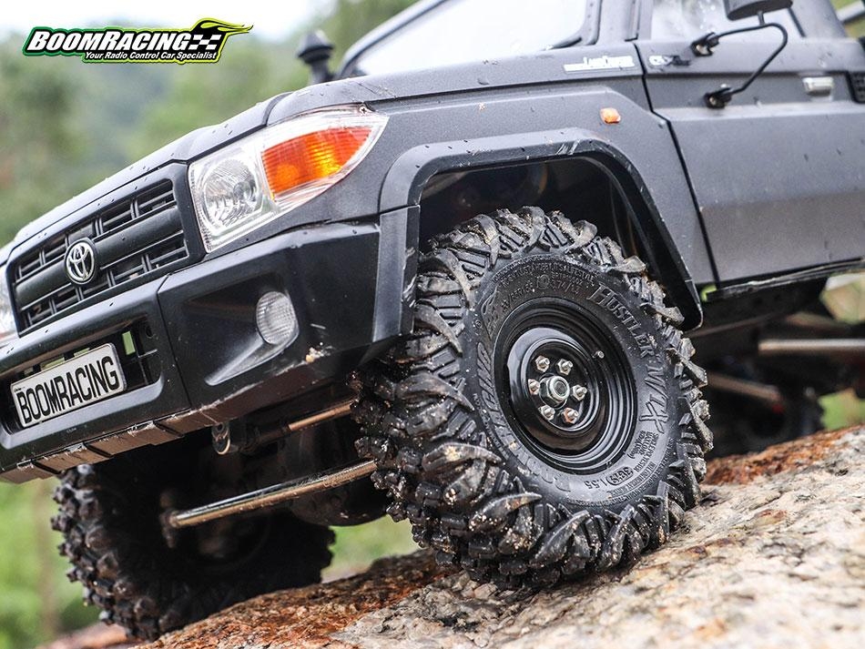 - This is Boom Racing's smallest HUSTLER tire to date. At 3.74"x1.3" (95x33mm) for 1.55" wheels, they are perfect for fitting scale body builds while giving great performance on the trails.