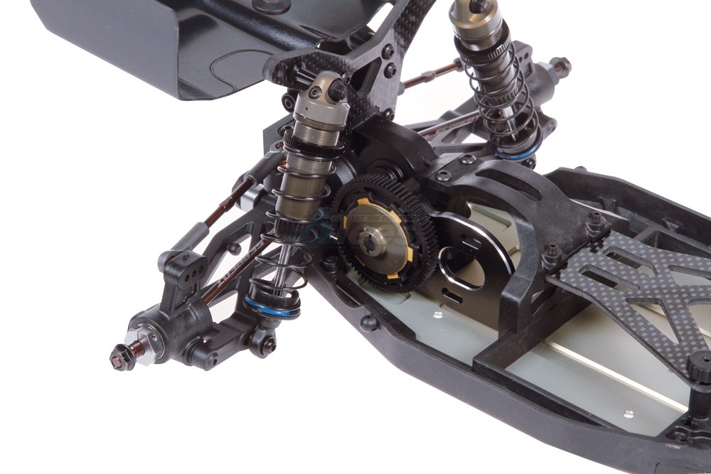 The composite rear transmission case is light and durable. It securely holds the motor plate, differential as well as supports the rear wing mount and rear shock tower.