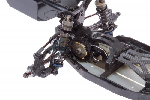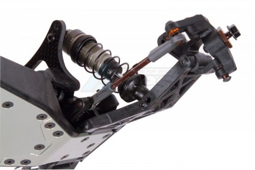 The wishbones are made from a super strong composite material. The gullwing arms to optimize the CG and pivot on 3mm captured pins on the inside and out. The arms have 2 mounting positions for shock angle and are prepared to use an optional anti-roll bar if needed.