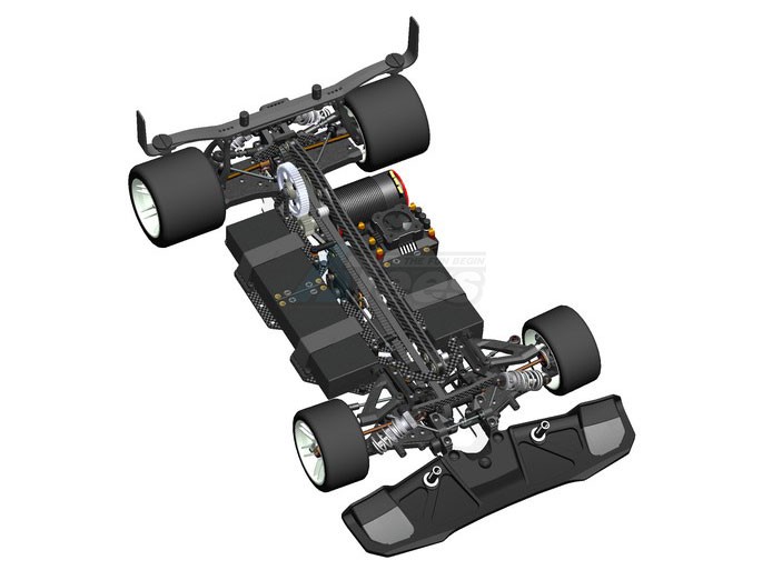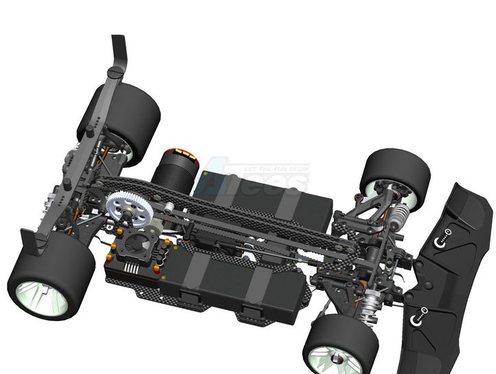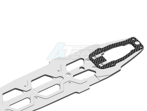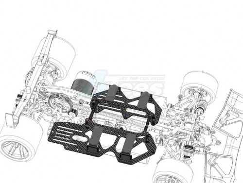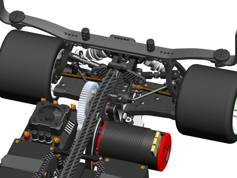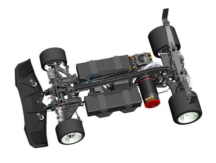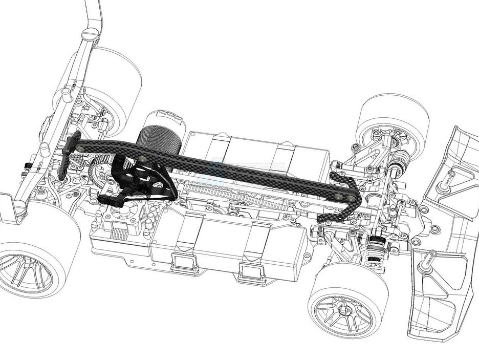 The vertically placed top decks stiffen the chassis in the longitudinal direction, while controlling the torsional flex. They are constructed of 2 high grade carbon plates that connect the central motor mount to the front and rear ends of the car. Their design was taken from our race proven 4X electric touring car and changed to the demands of the Viper 988E platform.