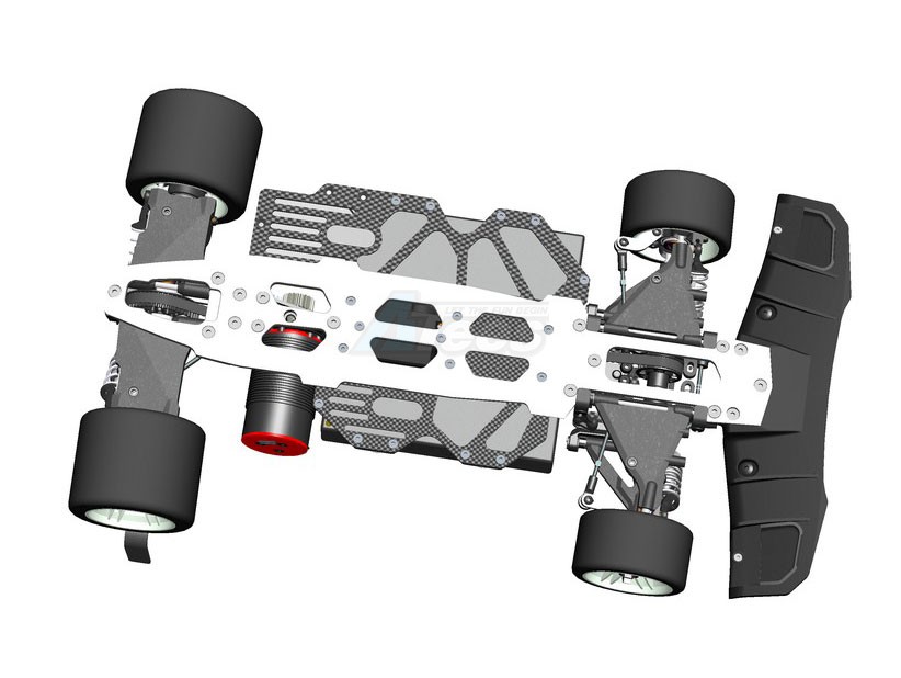 Very light, ultra-narrow 4mm chassis-plate with symmetric layout and central fixing points for suspension, batteries and electronics.