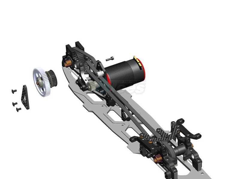The rear end construction with aluminium brackets is a very open design, which allows for easy of maintenance and cleaning. Dis-assembly requires the removal of only a few screws. Replacing a belt if needed, is a simple task. The eccentric bearing holders on the rear shaft allow adjustment of belt tension. The whole rear end can be removed as one unit from the chassis by removal of only a few screws.