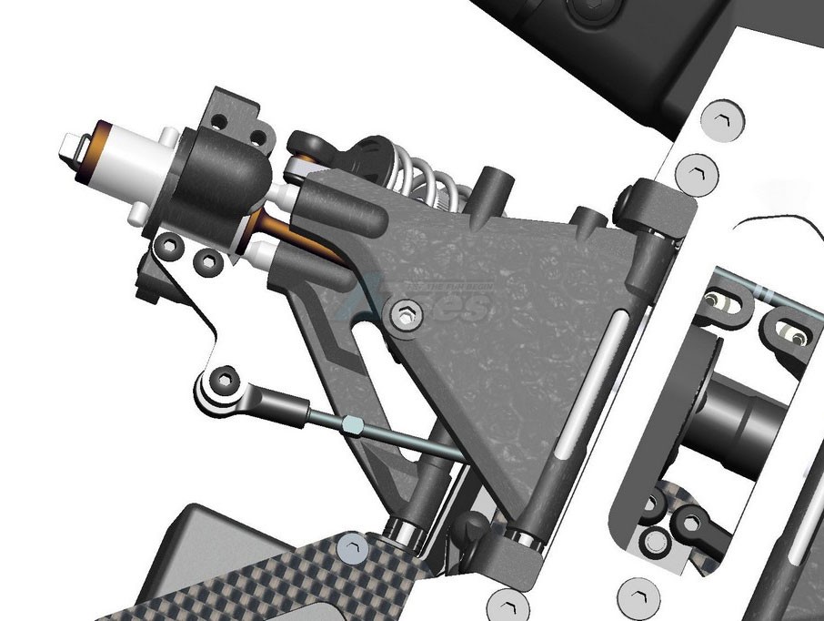 The rear floating body mount which is mounted on the up-rights with 2 arms is centred by a carbon-fibre and steel guider. The mount has 4 positions on each side to choose from, depending on body shell used and traction available. The threaded holes on the end of the body mount give the option to add further body-supports.