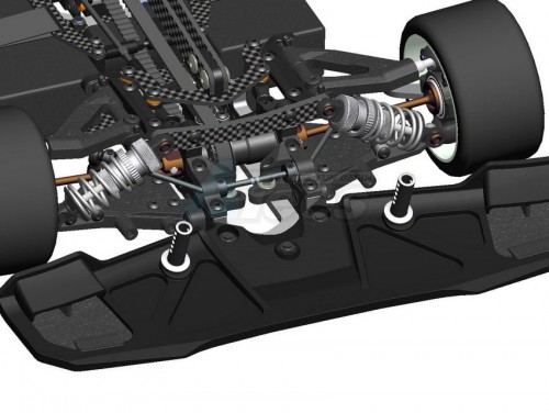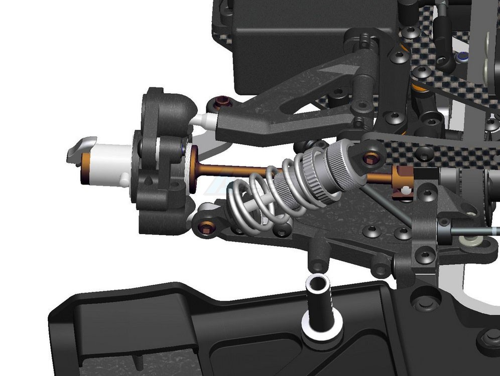 The long durable front lower wishbones are in a new hollow type design with closed bottom for improved aerodynamics and have separate top mounted moulded inserts. An aluminium shock mount plate is screwed onto the lower wishbone. This allows the shock attachment point to be placed further outwards improving shock motion. The front lower arms are mounted to the front brackets with nylon holders. The kit includes 2 versions: in and out. This system also enables quick and easy front drive shaft maintenance.