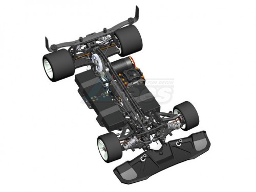 The black anodized aluminium front axle has Japan made one-way bearings. Spring steel drive cups connect to the long and thin spring-steel drive shafts with CVD system. The ball raced spring steel wheel axles have aluminium quick-change levers. The open front end design allows for very fast and easy removal of the front axle and driveline parts.